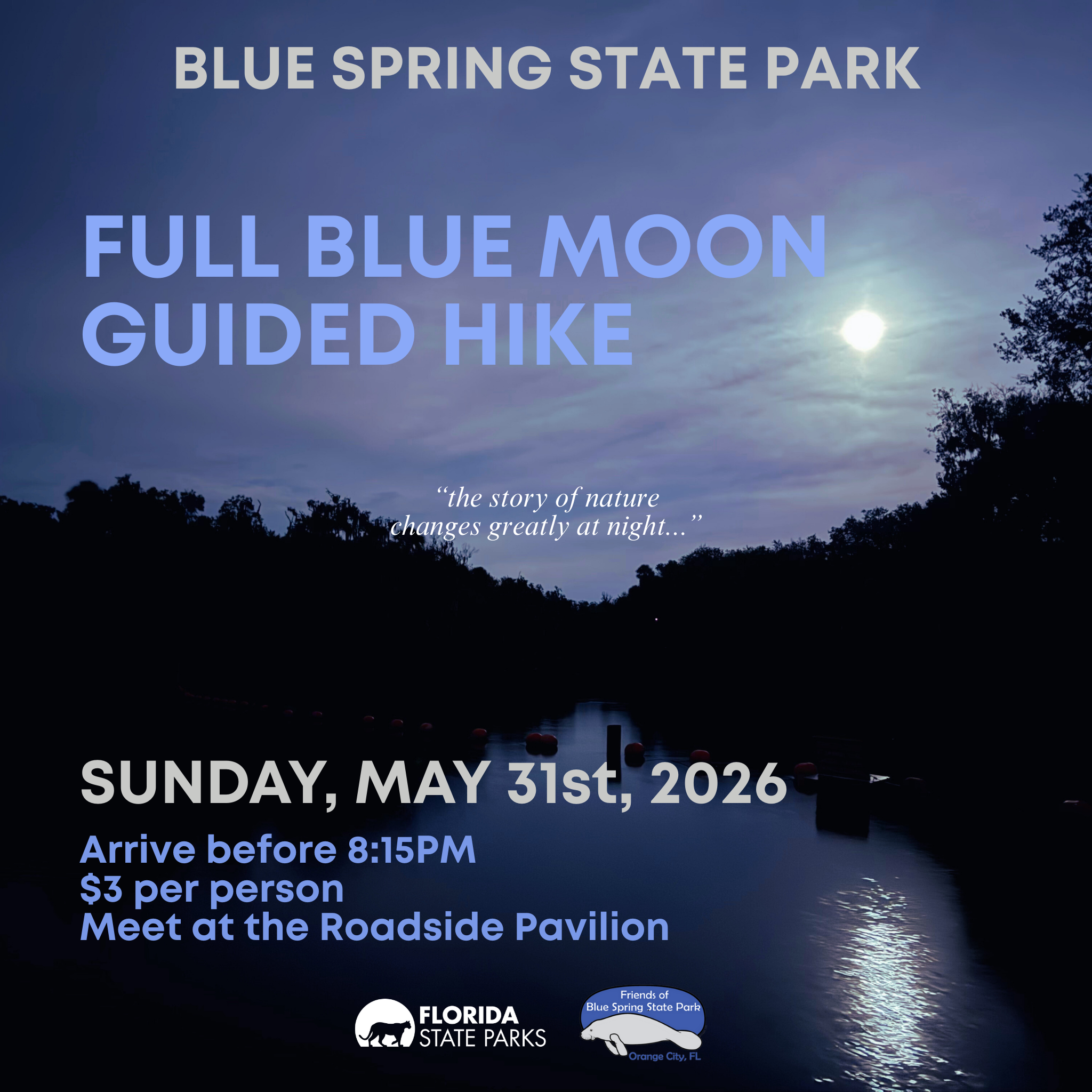Back to All Events Full Blue Moon Guided Hike Sunday, May 31, 2026 8:00 PM 9:30 PM Blue Spring State Park 2100 West French Avenue Orange City, FL, 32763 United States (map) Google Calendar ICS